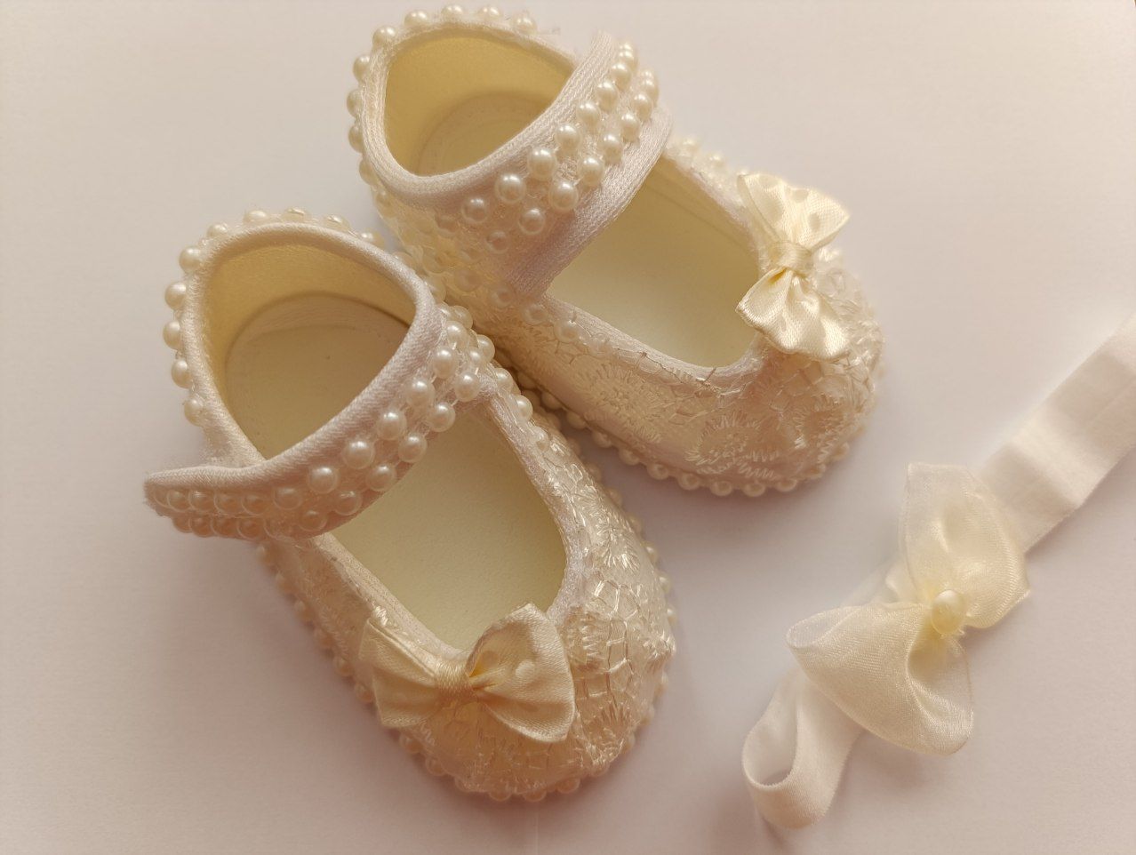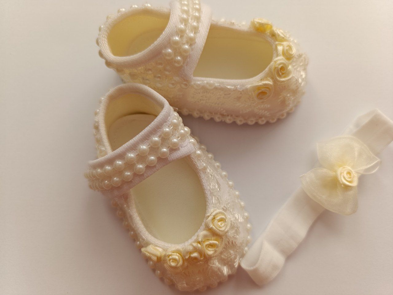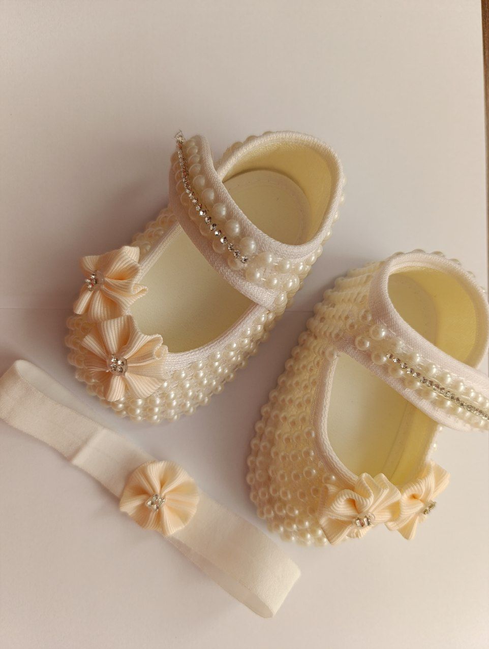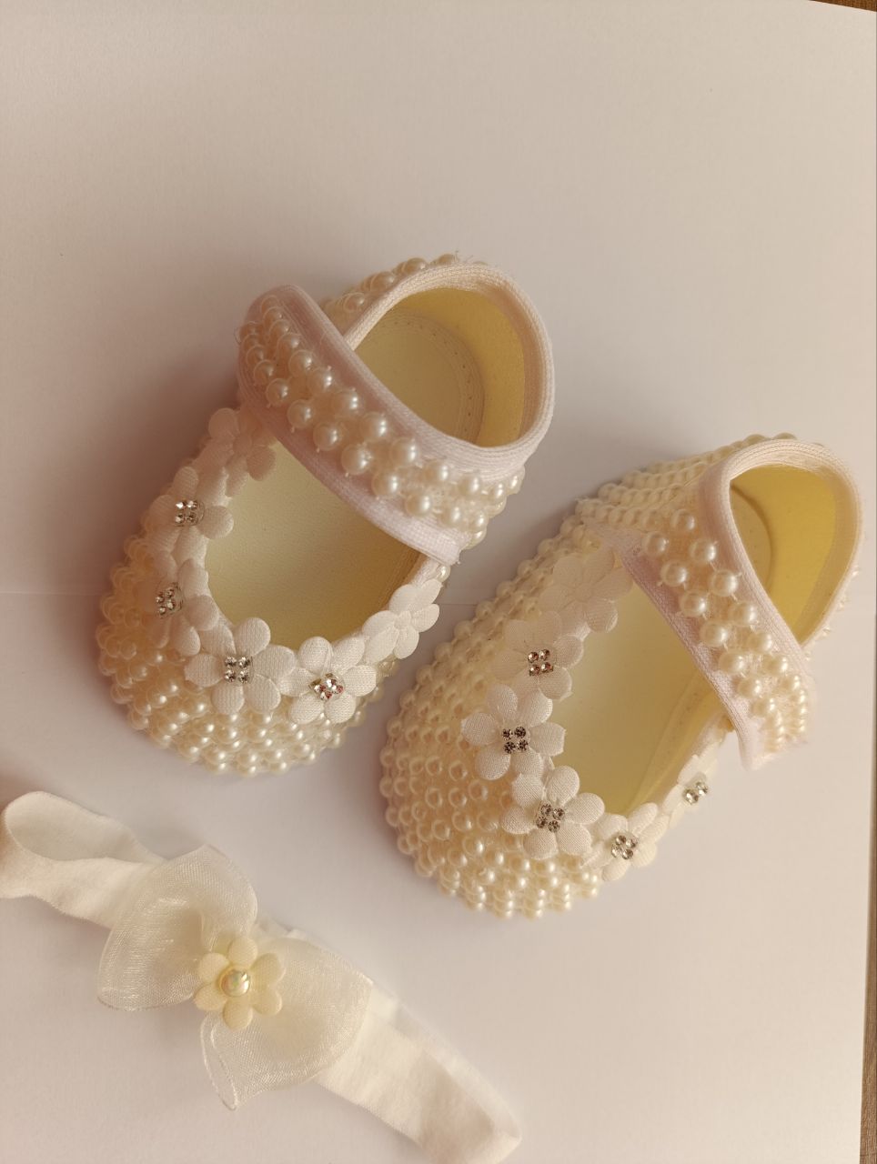 ست کفش و هدبند نوزادی دخترانه مرواریدی – مدل مجلسی سیسمونی شیدا