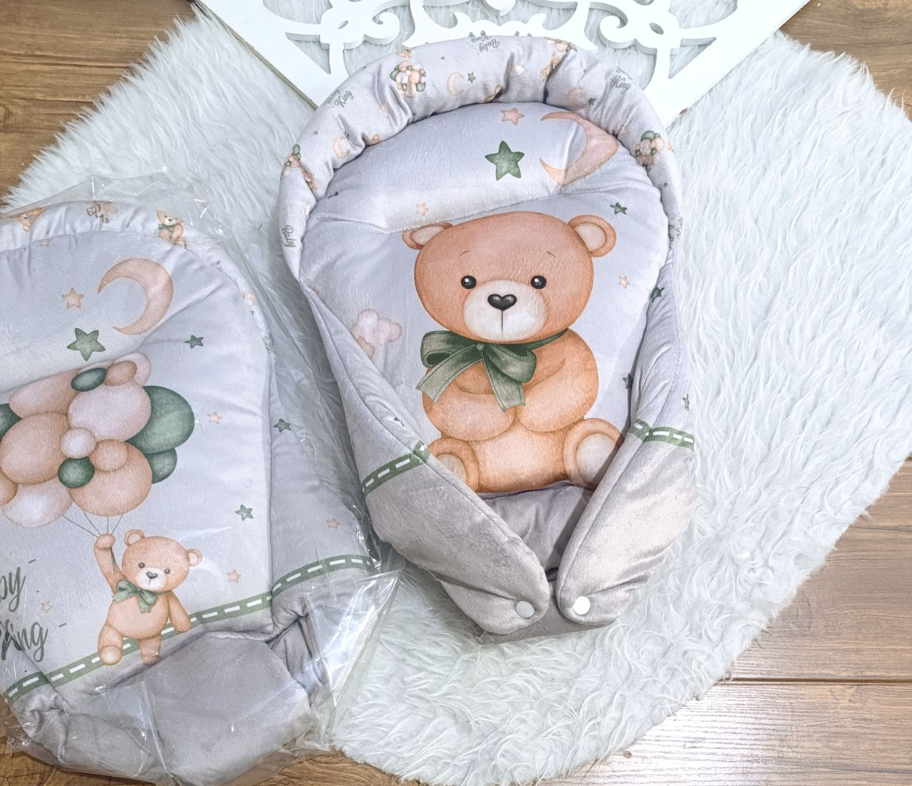 آغوشی نوزاد یا قنداق سوییسی مخمل چاپی طرح خرس رنگ طوسی | با کیفیت و شیک در سیسمونی شیدا