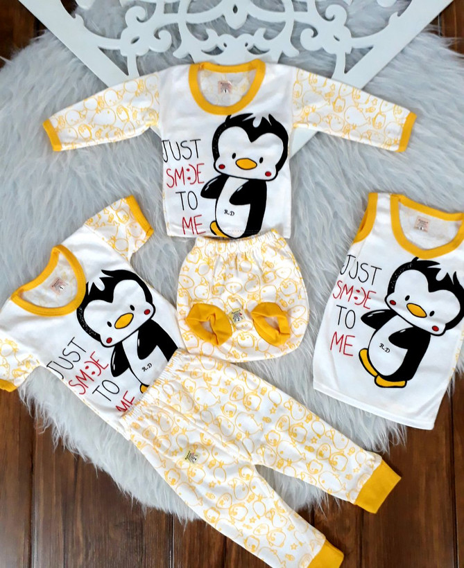 پنج تکه نوزادی طرح پنگوئن سایز ۱ تا ۳ لباس نوزادی رنگ زرد