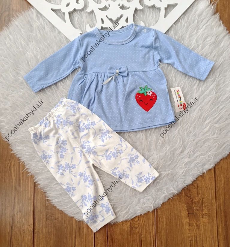 ست جذاب پیراهن و شلوار دخترانه طرح توت‌فرنگی – انتخابی شاد برای کوچولوهای نازنین