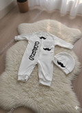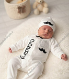 سرهمی نوزادی طرح تاج و سبیل از برند معتبر پوشاک شیدا، با جنس لطیف و ضد حساسیت انتخابی عالی برای نوزادان است. این لباس در رنگ سفید و با تزئینات مشکی زیبا شامل طرح تاج نگیندار و سبیل فانتزی دوخته شده است.