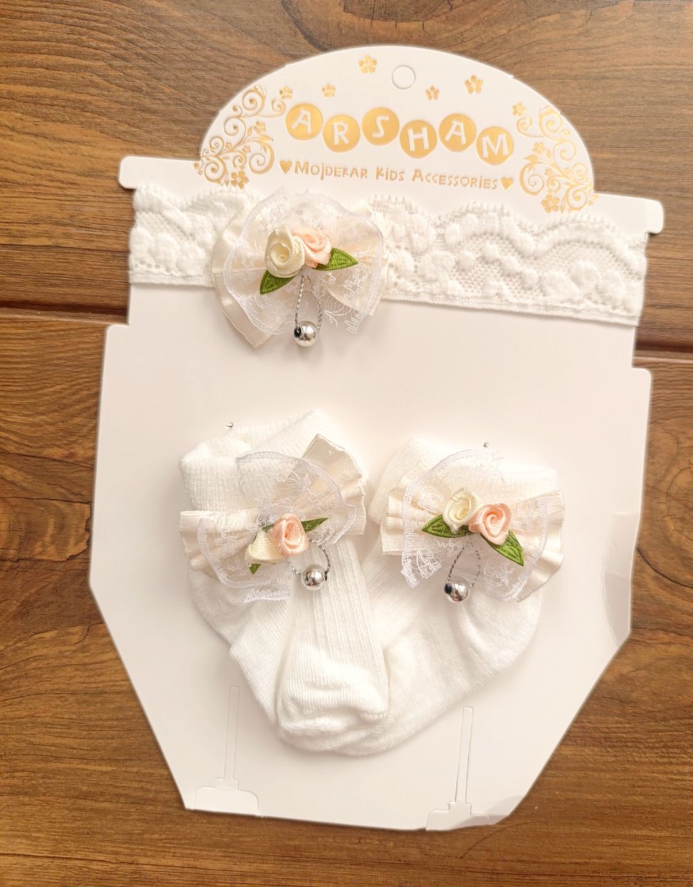 ناموجودست تل و جوراب نوزادی مجلسی مدل پاپیون توری و رز مینیاتوری (طرح زنگولهدار)
