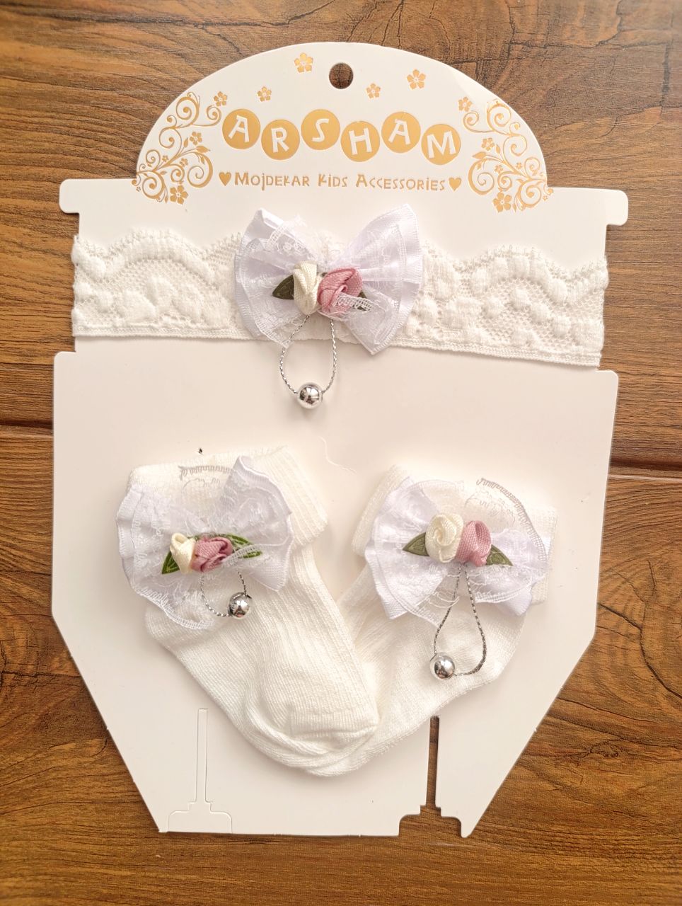 ست هدبند و جوراب نوزادی مجلسی آرشام مدل پرنسسی (طرح گل رز ) سیسمونی نوزاد شیدا