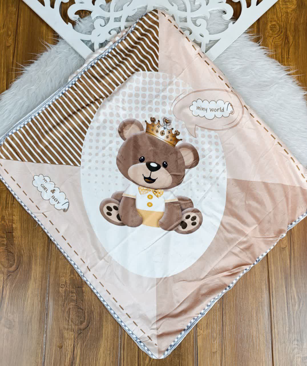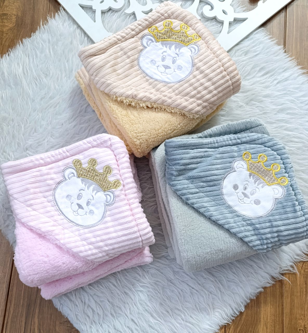 پتو دورپیچ نوزادی مخمل ریلی داخل خز طرح خرس تاجدار | نرم، گرم و فوقالعاده لطیف