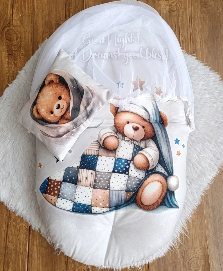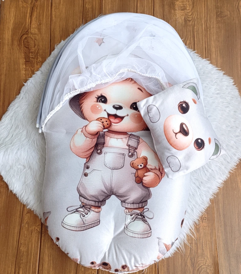 پشه بند نوزادی تشک و بالشدار مخمل مدل خرس | سیسمونی شیدا